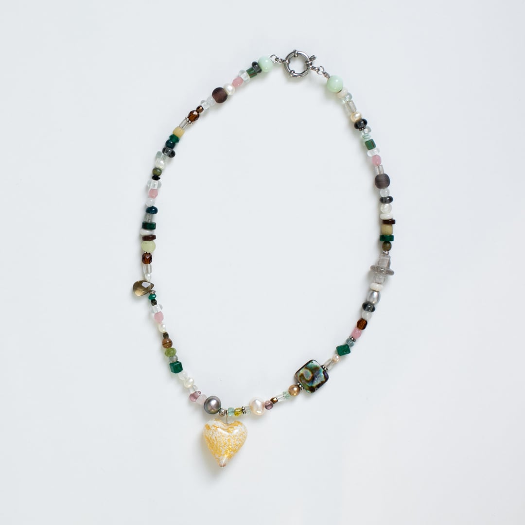 素材:シルバー975、パール、マザーオブパール、インペリアルジャスパー、水晶、グリーンオニキス、ムーンストーン、ラブラドライト、トルマリン、チェコガラスビーズ、ヴェネチアガラスビーズ、ボルネオガラスビーズ、インドガラスビーズ